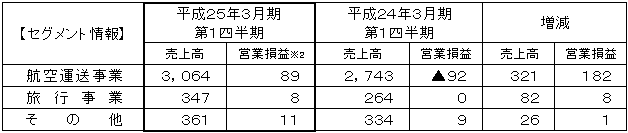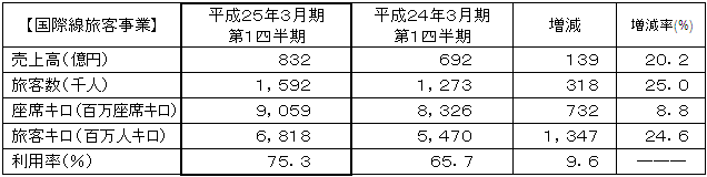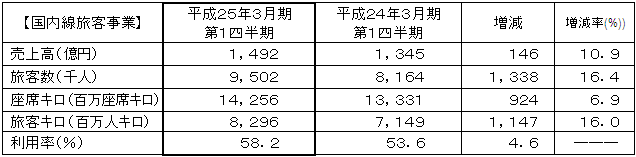 このような経済情勢のもと、堅調に推移するビジネス需要に加え、回復する旅行需要を確実に取り込み、東日本大震災の影響を受けた前年同期と比較して、大幅な増収となりました。 |