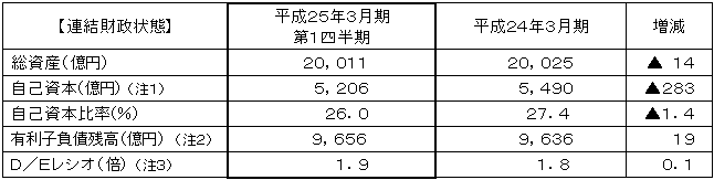 当第1四半期のわが国経済は、昨年発生した東日本大震災からの復興需要等を背景として景気は緩やかに回復しておりますが、欧州政府債務危機の先行き不安が高まるなか、世界景気の減速感が広がっており、先行きは不透明な状況となっております。 |