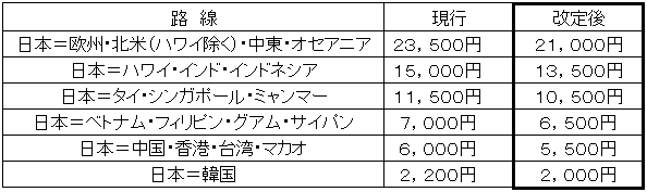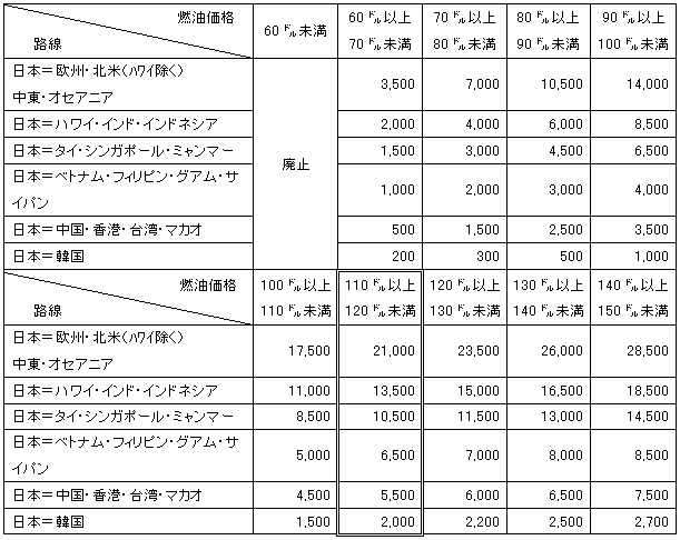 | ANAグループ(※)は、本日2012年8月14日(火)、2012年10月1日(月)以降の航空券ご購入分の国際線旅客「燃油特別付加運賃(いわゆる燃油サーチャージ)」の改定を国土交通省に申請いたしました。(※)ANA、AJX(エアージャパン) 当社グループでは、燃油特別付加運賃を申請時点における直近2カ月の航空燃油市場価格の平均に基づいて見直すこととしております。今般、2012年6月から7月における同価格の2カ月平均が1バレルあたり113.94米ドルとなったため、改定することといたしました。何卒、ご理解のほどよろしくお願い申し上げます。 |
