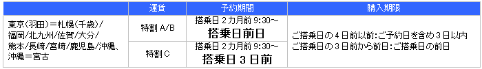 | *ご予約・ご購入期限が搭乗日の前日の路線は、以下の通りです。 東京(羽田)=大阪(伊丹・神戸・関西)・岡山・広島・岩国・山口宇部・秋田・庄内・富山・小松・高松 大阪(伊丹・関西)=福岡、大阪(伊丹)=熊本・鹿児島、名古屋(中部)=福岡、 札幌(千歳)=女満別・釧路・函館、福岡=宮崎、宮古=石垣 |