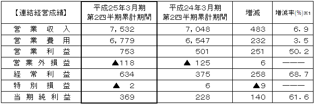 これらの結果、当第2四半期の連結経営成績は営業収入が7,532億円、営業利益は過去 最高の753億円、経常利益においても過去最高の634億円、四半期純利益は369億円となり、増収増益となりました。 |