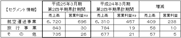 当第2四半期のわが国経済は、復興需要もあり引き続き底堅さが見られました。一方、欧州や中国等の海外経済環境による世界景気の減速感も広がるなど、一部に不透明な状況も見られましたが、堅調に推移するビジネス需要に加え、プレジャー需要を確実に取り込んだ結果、前年同期と比較して、大幅な増収となりました。 |