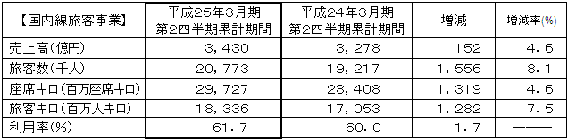 | 結果として、国内線旅客収入は152億円の増収(前年同期比4.6%増)となりました。 |