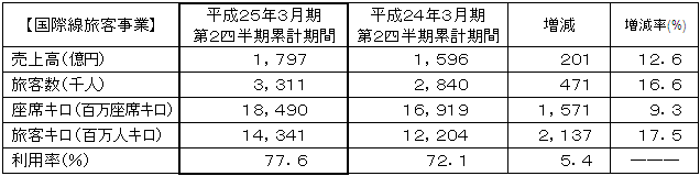 国際線旅客事業は、ビジネス需要、プレジャー需要が堅調に推移し、震災影響を大きく受けた訪日需要も、訪日キャンペーン「IS JAPAN COOL?」第2弾等にて需要喚起に努めたこと等により確実に回復し、旅客数は前年同期を大幅に上回りました。 |