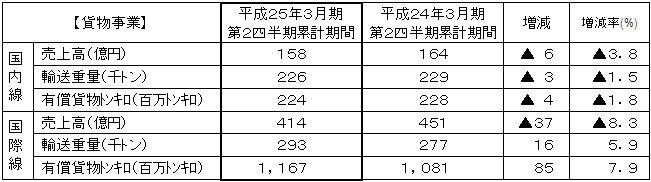 | 結果として、国内線貨物収入は6億円の減収(前年同期比3.8%減)、国際線貨物収入は37億円の減収(前年同期比8.3%減)となりました。 |