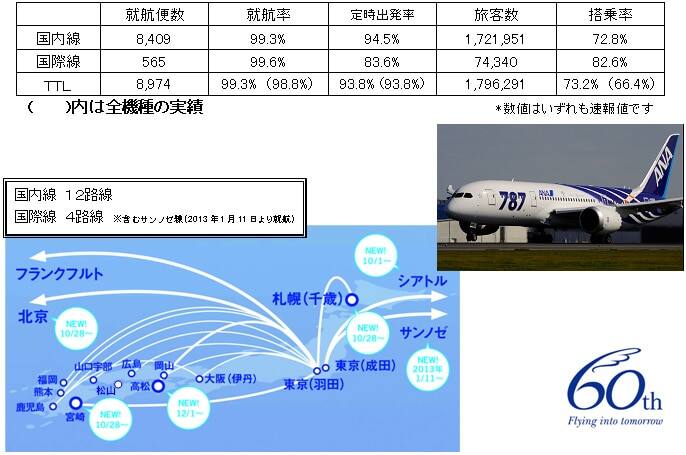 2012年11月1日で、ANAはボーイング787(以後、787)の定期便就航(羽田-岡山・広島)から1周年を迎えました。ローンチカスタマーとして、世界に先駆けて787を受領し、この1年間で就航回数は国際線、国内線合わせて約9,000回、ご利用のお客様は約180万人となり、改めて多くの方にご利用いただきました事に感謝申し上げます。 787運航便は他機種の運航便に比べて、平均で一割程度搭乗率が高く、787の国内線平均搭乗率は72.8% 国際線では82.6%となっております。 現在、ANAは787を16機受領しており、世界最多の保有数を誇ります。また、9月に11機の787−9の追加発注を決定し合計で66機を発注しております。ANAは787シリーズの発注数でも航空会社として世界最多となっており、“アジアでNo1の航空会社グループ”を目指す当社の成長戦略を担う原動力となると考えております。ANAではこの快適で低燃費な787を積極的に活用し、引き続きネットワークの拡大を図ってまいります。