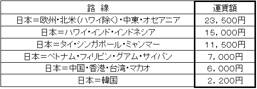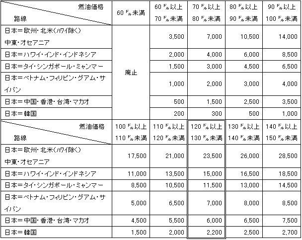 ANAグループ(※)は、本日2013年2月12日(火)、2013年4月1日(月)以降の航空券ご購入分の国際線旅客「燃油特別付加運賃(いわゆる燃油サーチャージ)」を国土交通省に申請いたしました。 (※)ANA、AJX(エアージャパン) 当社グループでは、燃油特別付加運賃を申請時点における直近2カ月の航空燃油市場価格の平均に基づいて見直すこととしております。今般、2012年12月から2013年1月における同価格の2カ月平均が1バレルあたり126.51米ドルとなったため、現行と同額のテーブルを適用致します。 |