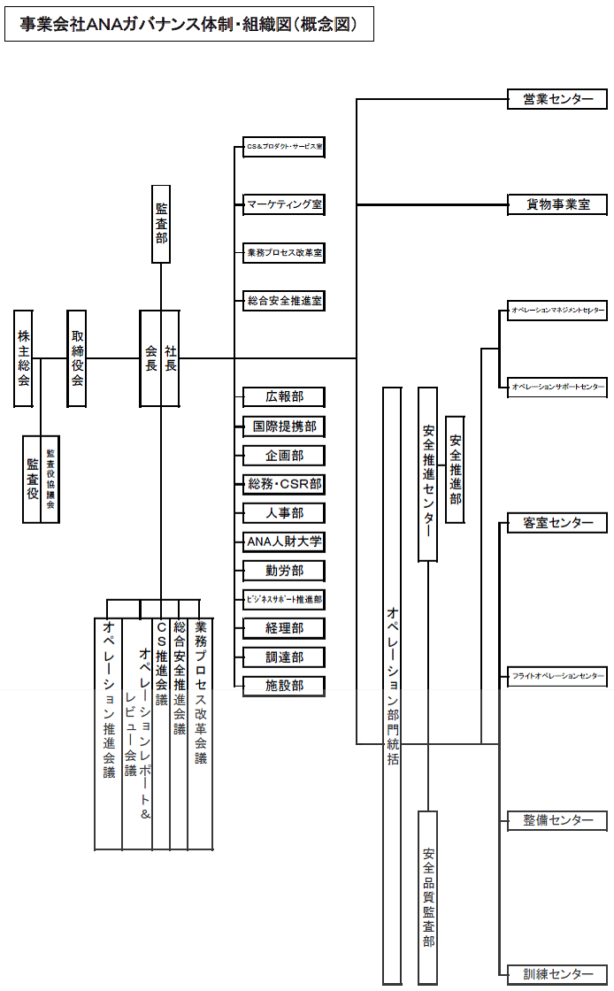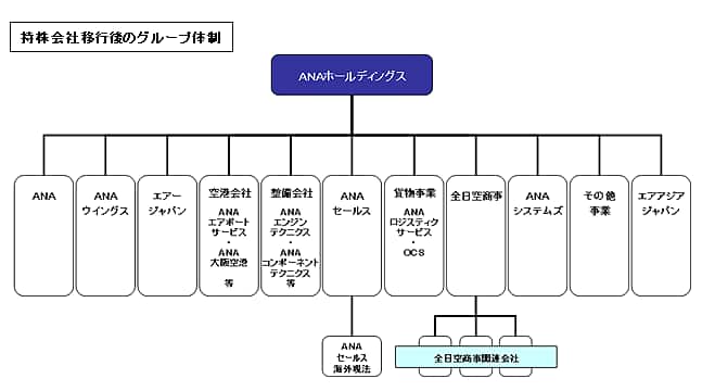 全日本空輸株式会社(本社東京都港区、代表取締役社長:伊東信一郎、以下「ANA」)は、2013年4月1日付で予定している持株会社制への移行後の組織体制について決定いたしましたので、その概要をお知らせいたします。 上記決定により2013年度より「新生ANAグループ」として、新たな体制で現在の「航空大競争時代」を勝ち抜くべく、今後の経営を推進してまいります。 1.背景 日本の航空業界を取り巻く環境は、首都圏空港容量の拡大や航空自由化の更なる進展、LCCの相次ぐ就航等、大きな転換期を迎えております。今後、既存の日系キャリアはもとより、アジア・欧米のメガキャリアやLCC、更に新幹線など他交通機関も含む競争の激化が予想されています。 2.目的 ANAグループは、これまで以上に安全性の維持・向上を図りつつ、お客様に選ばれ続けるために日々変化するマーケットに機動的に対応し、企業価値・株主価値の向上を図ることを目指して持株会社制へ移行いたします。この目的は、以下の通りです。 (1)グループ経営の強化 (2)各事業会社の自律的経営による効率経営の実現 上記にあたり、「経営方針の決定・進捗管理」と「業務の執行」の分離を実現するとともに、グループ各社に権限と責任を委譲することにより、お客様ニーズを的確に把握し、スピーディーに品質・コスト両面にわたり最適な業務の執行を目指します。これにより、グループ収益の最大化を実現していきます。 3.持株会社制移行後のグループ体制 持株会社制移行後のグループ体制は以下の通りです。