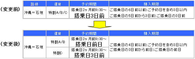 | (1)適用開始日 : 2013年7月10日(水)搭乗分から (2)変更内容 : 沖縄=石垣線の「特割A」および「特割B」の予約・購入期限を搭乗日の「3日前」から 「前日」に、「特割C」の購入期限を搭乗日の「3日前」から「前日」に拡大 ![]() ※ 2013年5月21日(火)ご購入分からの適用となります。 |