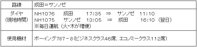 ANAは、2013年6月1日より週5便にて運航再開しております成田=サンノゼ線を、2013年7月10日(水)より増便し、週7便(デイリー運航)とすることを決定いたしました。 成田=サンノゼ線の増便分の予約・販売については2013年6月12日(水)から開始いたします。 週7便の運航となり、ますます充実したANAの国際線ネットワークを、ビジネスや観光に、ぜひご利用ください。皆様のご利用をお待ち申し上げております。 |