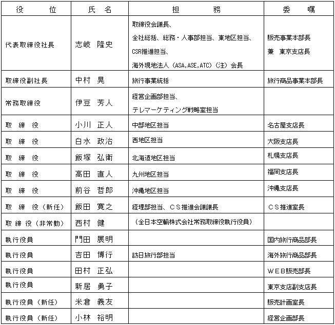 ANAセールス株式会社では、本日6月11日(火)開催の定時株主総会および取締役会において、本日付けで、取締役の選任・担当業務の変更、執行役員の選任、監査役の選任を決議いたしましたので、お知らせいたします。 |