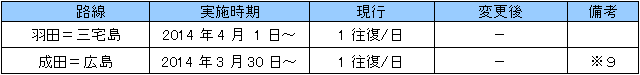 ANAは、本日、2014年サマーダイヤ分(2014年3月30日〜2014年10月25日)の国内線ダイヤについて、国土交通省に申請・届出を行いました。 ANAでは、引き続き皆様に便利にご利用いただける国内線ネットワークの拡充に努めてまいります。これからもANA国内線ネットワークをぜひご利用ください。 |