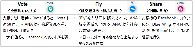 | ANAは、途上国を中心に困難に直面する人々を救うため世界中で奮闘する社会起業家(*)とお客様、そしてANAをつなぐ“Blue Wing : Wings for Changemakers”サイトを開設しました。 ANAは「安心と信頼を基礎に世界をつなぐ心の翼で夢にあふれる未来に貢献します」というグループ 経営理念のもと、日本を代表するグローバルエアラインとして、世界の社会課題に真摯に向き合い、エアラインだからこそできる価値を提供していきたいと考えています。 この“Blue Wing”プログラムは、米国に拠点を置く世界最大の社会起業家ネットワーク、「アショカ」 (※1)と協力し、ANAがBlue Wing(青い翼)となって5名の社会起業家を応援するものです。プログラムを通して、国際社会が抱えるさまざまな課題や取組みについて、より多くのお客様に関心を持っていただくきっかけとなり、共感いただいたお客様はANAと共に気軽に活動を応援することができる仕組みです。 Blue Wingは「ANAバーチャルハリウッドプログラム」(※2)として、ANA社員が発案し、実現しました。 ANAは今後もエアラインらしく「挑戦し続ける」心の翼を持って、より良い未来づくりに向けた取り組みを続けていきます。