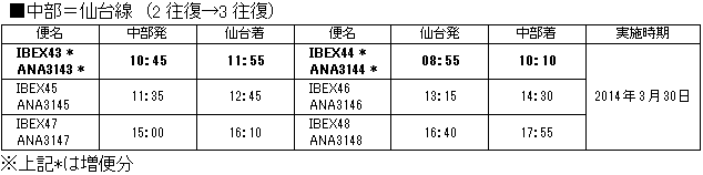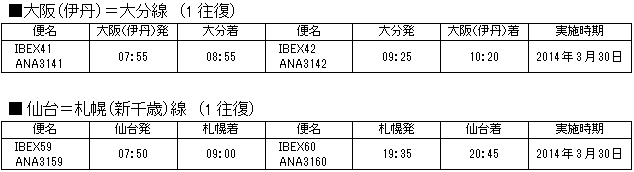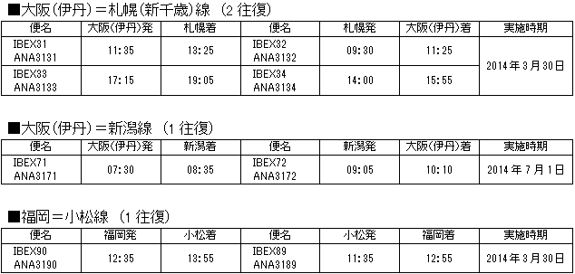 アイベックスエアラインズ株式会社(以下IBEX)と全日本空輸株式会社(以下ANA)は、IBEXが2014年3月30日(日)からのサマーダイヤ期間中に開設・再開する5路線、ならびに増便する1路線において、コードシェア(共同運航)を行うことで合意し、国土交通省に申請・届出を行いました。 |