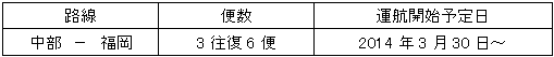 全日本空輸株式会社(ANA)と株式会社スターフライヤー(SFJ)は、2014年3月30日(日)より、SFJが中部−福岡間で運航を始める1日3往復6便において、コードシェアを開始します。 ANAとSFJは現在、SFJが運航する羽田−北九州線、羽田−関空線でコードシェアを行っており、2014年2月1日からはSFJが運航する羽田−福岡線においてもコードシェアを開始します。中部−福岡線は、両社でコードシェアを実施する4路線目となります。 ANAおよびSFJは、コードシェアを行うことで、今後もお客様の利便性向上に努力を続けてまいります。 <新規コードシェア実施路線> ※ 発売日は2014年1月30日を予定しております。運航ダイヤおよび運賃等の詳細は決定次第お知らせいたします。 |