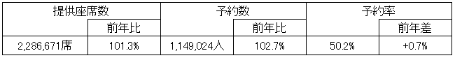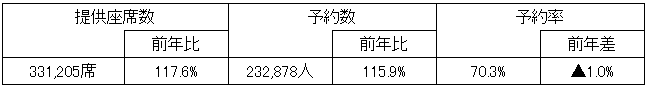 | 【国内線】 ・昨年に比べ連休が少なく日並びが悪い中、バリエーションを拡大した「旅割」運賃を中心にプレジャー需要が好調に 推移しており、予約数は前年を2.7%上回っております。 ・方面別では、沖縄方面・九州方面が好調です。 ・期間中のピーク日は、以下の通りです。 下り便 : 5月3日(土) 上り便 : 5月6日(火) 【国際線】 ・羽田空港を中心とした路線拡大により、予約数は前年を16%上回っております。 ・連休が短い日並びであることから、短距離路線が好調です。 ・サマーダイヤからの新規就航路線は予約率が約7割と好調に推移しています。 ・アジア・リゾート路線、なかでもベトナム・フィリピン・タイ・台湾などの路線が好調です。 ・期間中のピーク日は、以下の通りです。 日本発 : 4月26日(土)・27日(日)・5月3日(土) 日本着 : 4月30日(水)・5月5日(月)・6日(火) 日程・便によってはまだ空席もございます。是非ご利用ください。 |