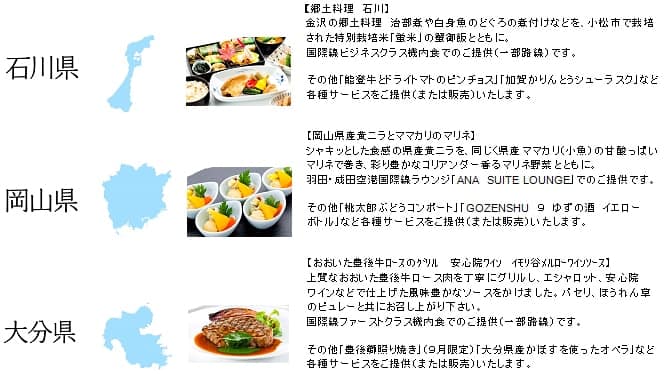 | 【機内・空港ラウンジでご提供する各県の特産品を使った食事・デザートの一例】 | |||||||||||