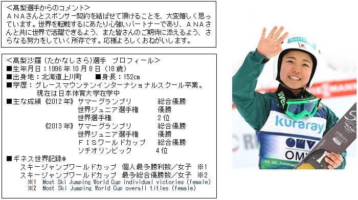 ANAは、スキージャンパー髙梨沙羅選手とスポンサー契約を締結致しました。髙梨沙羅選手は、2011年2月に開催されたコンチネンタルカップで、国際スキー連盟公認国際ジャンプ大会での女子選手史上最年少優勝を果しました。2013/2014シーズンでは、ワールドカップ個人で18戦15勝というFISワールドカップ女子最多優勝記録を塗り替え、史上初の7連勝とシーズン全戦での表彰台獲得を達成し、2年連続のワールドカップ総合優勝を飾りました。 |