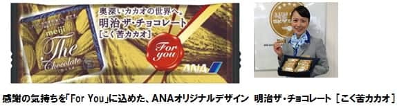 全日本空輸株式会社(以下 ANA)と株式会社 明治(以下 明治)は、2015年2月14日(土)のバレンタインデー当日限定で、ANAにご搭乗いただいたお客様全員を対象に、機内にて両社がコラボレーションしたチョコレート「ANAオリジナルデザイン 明治ザ・チョコレート」をプレゼントいたします。 |