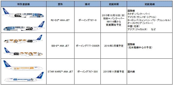 今年4月に発表し、10月初旬に日本に到着する予定の『R2-D2™ ANA JET』を皮切りに、特別塗装機は以下の通り世界各地へ就航予定です。就航スケジュールは、www.ana-sw.comをご参照ください。 ※上記サイトに掲載される就航路線は予定であり、予告なく変更となる可能性があります。