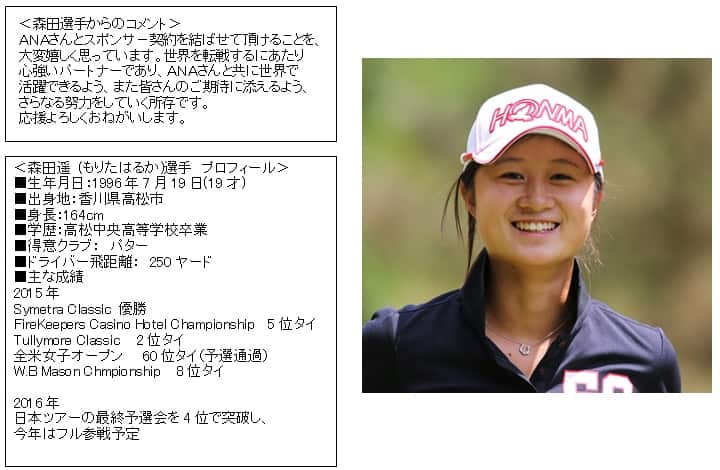 ANAは、女子プロゴルファー森田遥選手とスポンサー契約を締結致しました。森田遥選手は、9歳からゴルフを始め、高校2年の時に日本女子アマチュア選手権で優勝し、2013年には日本代表チーム入りを果たしました。2015年、プロ転向後は、『世界一』という大きな目標を掲げて単身で渡米し、メジャー大会である全米女子オープンで予選を通過するなど、世界のトッププロの間でも通用する力を示しました。2016年は日本ツアーへの初参戦を予定していますが、今後は『世界』を目指す予定です。 |