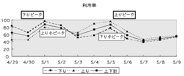 | ※ | 期間中のピーク日は下り便が5月1日(土)、2日(日)、4月 29日(木)、上り便が5月5日(水)、4日(火)となりまし た。 また、5月1日と5日はそれぞれ、逆方向についても小さな山となり5月1日は歴代2位、5日は3位 の実績となりました。 |