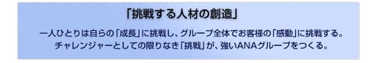 ANAグループが人事理念として掲げる「挑戦する人材の創造」は、 一人ひとりの成長の上にANAの発展があり、 ANAの発展の原点は“お客様にこだわること”であることを明言したものです。 ANAは個々人の自律的な成長を支援し、意欲と持ち味を活かす人材開発・活用を目指しているのです。 |