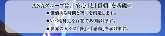 お客様に徹底的にこだわる企業として、お客様の歓びを通じて私達も仕事に誇りと自信を持ち、お客様とANAとの間で常に新たな歓びを創り出して行きます。