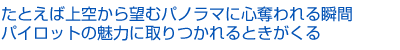 | 大学時代は、ゴルフ部に所属し、ゴルフ中心の日々を送ってきたものですから、パイロットになるための特別な準備を重ねてきたわけでもありません。しかし就職を考えるときになって、その進路について自らに問いかけたときには、パイロット以外の選択肢は浮かばず、迷わずに選考に臨みました。ただ同期の声を聞くと、パイロットをめざしたきっかけはさまざまで、はじめからパイロットになりたいと強く思っていた者ばかりとは限らないようです。しかし共通しているのは、誰もが必ず、パイロットという仕事の魅力に取りつかれてしまうということです。ある者は上空から望む広大なパノラマに心奪われる瞬間を体験して、またある者は一人では到底クリアできそうにない試練を、同期との絆によって乗り越えたときに。みなさんにも、パイロットという選択が正しかったことを実感できるときが必ずやってくると思います。 |