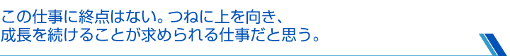 | 副操縦士の資格を取得し乗務できるようになるまでには、厳しい訓練を乗り越える必要があります。しかしけっして、そこがゴールではありません。そこからすべてがはじまるといっていいでしょう。採用選考の時期に、新聞で引退を間近にひかえた機長のインタビュー記事を読んだのですが、そこには「40年この仕事を続けてきたけれど、じぶんに100点をあげられるフライトは一つもなかった」という内容のコメントが掲載されていました。当時は、その意味が十分に理解できていなかったかもしれませんが、深い感銘を受けたことを覚えています。確かに私たちの仕事には、これだけやれば大丈夫ということがありません。つねに上をめざしてチャレンジし続けることができる奥深い仕事なのです。私も、その機長のように、引退するその日まで、上を向き、成長し続けることができるよう、日々フライトをしていきたいと考えています。 |