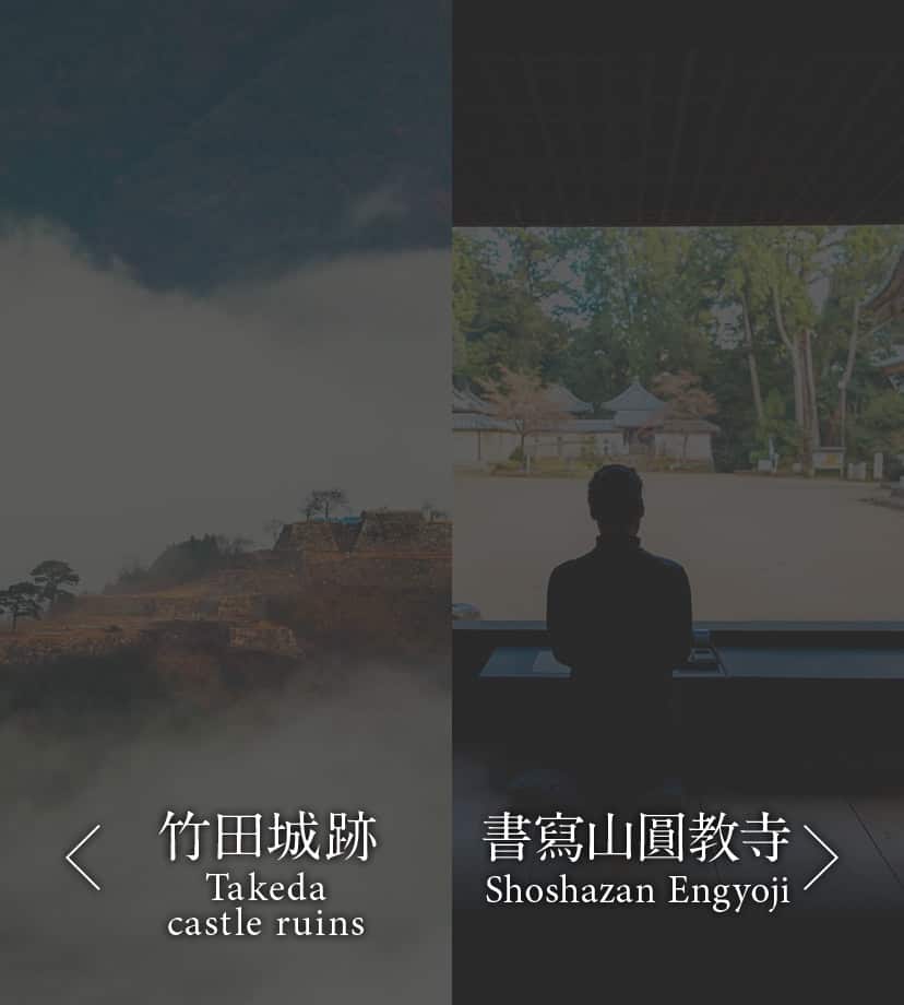 山の麓はかつての城下町の面影が見られる趣きのある風景が続いている。周辺には散策の疲れを癒す食事処が点在し「旧木村酒造場 EN」もそのひとつ。400年ものあいだ、竹田の地で酒造りに情熱を注いできた老舗酒造場を改築したレストラン・カフェ、さらには宿泊所等を併設する複合施設で、地元の食材を活かした料理を味わえるのもうれしいところ。ここからは山頂の竹田城跡を下から眺めることもできて、当時の庶民も同じ風景を眺めていたのかもしれない。