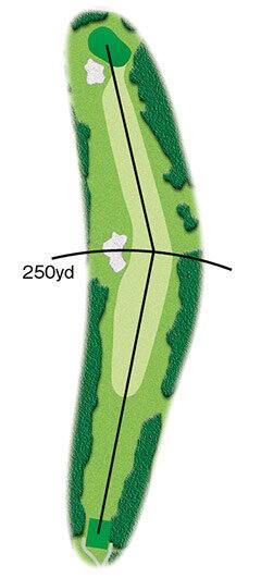 250ヤード付近にバンカーが待ち構える、やや左ドッグレッグのホール。風がフォローの場合は、バンカー越えを狙いたくなる。グリーンは受けが強く、上につけると難しくなる。