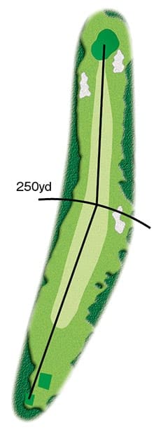 左からの風を感じることが多い距離のあるミドルホール。右サイドにはバンカーと深いラフが待ち受けているため、ティーショットは左サイドのフェアウェイを捉えたい。セカンド地点は全体的に右に傾斜しているため、ピンまでの距離感を出すのが難しい。