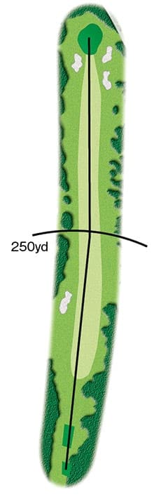 左右ともOBがなく、林も苦にならないので、どのプロも目一杯叩いてくる。フェアウェイもほとんどフラットで、2オンしてイーグルも狙えるホールだ。グリーンは右下がり。ピンが左に切ってあれば、逆らわずに右サイドから狙いたい。