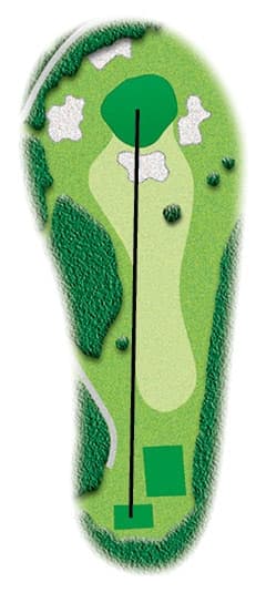 風によって5番~9番アイアンまで幅広いクラブを要求されるホール。風の影響をどう計算するのかが難しいホールの1つ。グリーン手前にはバンカーがあり、グリーン奥に外してしまうと更にピンに寄せるのが難しいアプローチが待っている。