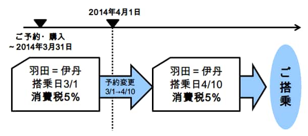 2014年3月31日(月)までに現行税率(5%)でご購入いただいた予約変更ができる運賃の航空券の搭乗日を変更する場合も、現行税率(5%)が適用となります。