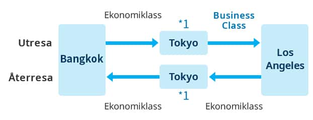 För en resplan med en utresa (Bangkok till Tokyo*1 till Los Angeles) i Business Class och en återresa (Los Angeles till Tokyo*1 till Bangkok) i ekonomiklass, delas flygmilen som krävs för varje klass med två och summeras sedan.