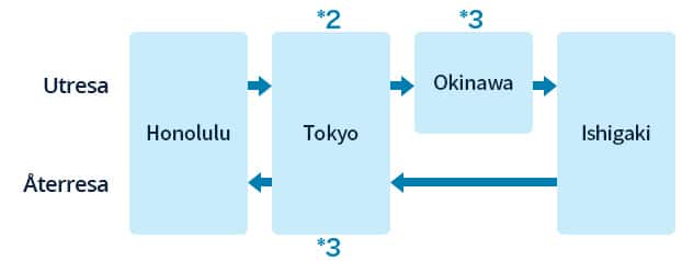 Honolulu ⇒ Tokyo*2 ⇒ Okinawa ⇒ Ishigaki*3 ⇒ Honolulu