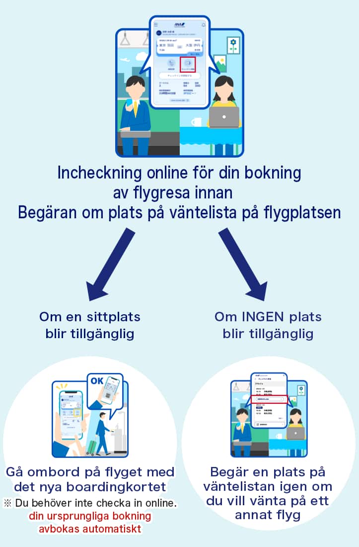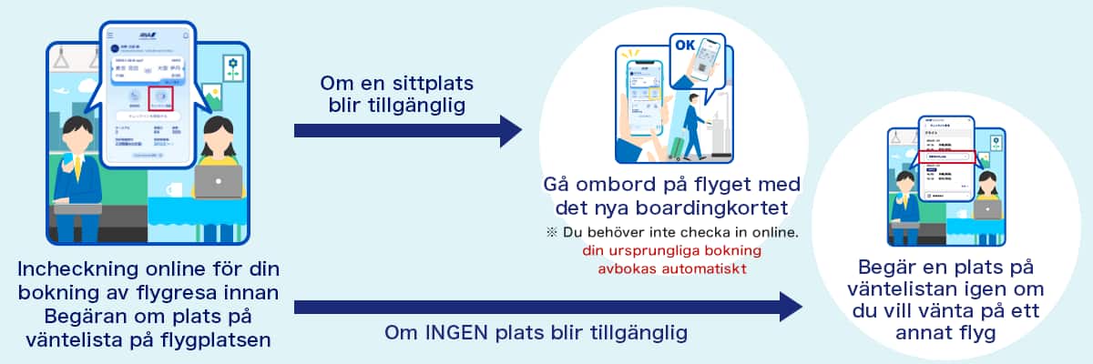 | Om en plats tilldelats | Om du får en sittplats via väntelistan på flygplatsen avbokas din ursprungliga bokning automatiskt. * Om du vill resa med ditt ursprungliga flyg måste du avbryta ansökan om väntelista senast 20 minuter före avgång för flyget i ansökan. När en plats är tillgänglig checkas du automatiskt in på det flyget. |