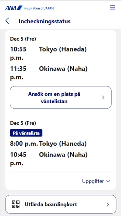 | Förutsättningar | När du ansöker om en plats på väntelistan på ANA:s webbplats måste du checka in för din bokade flygning. |