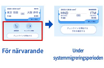 För flyg som avgår från en flygplats med det gamla systemet visas inte knapparna Ändra sittplats, Avbryt/ändra incheckning eller Skriv ut boardingkort på startskärmen i ANA-appen från 24 timmar före den schemalagda avgångstiden. I stället visas knappen Checka in/visa bokning.