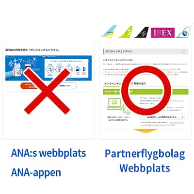 Om din första flygsträcka trafikeras av ANA och du har ett anslutningsflyg som trafikeras av ett annat flygbolag, som tillåter incheckning för hela resan, kan du checka in online via ANA:s webbplats eller app. Slutför incheckningen online via webbadressen i meddelandet ”Information om incheckning” från det trafikerande flygbolaget.