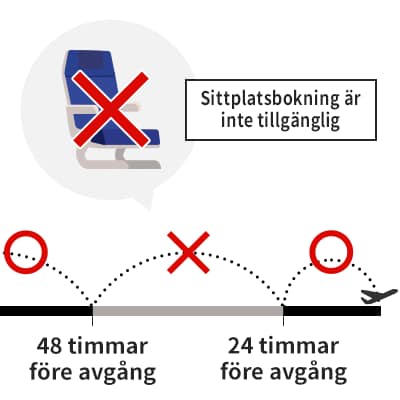Det går inte att boka sittplats mellan 48 och 24 timmar före avgångstiden för flyg som avgår från en flygplats med det gamla systemet. För biljettyper som tillåter förhandsbokning av sittplats måste du göra platsbokningen senast 48 timmar före avgång eller när du checkar in online eller vid en flygplatsdisk.