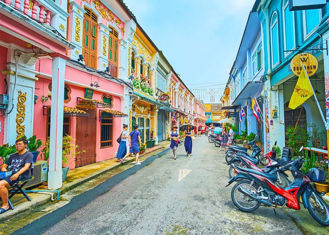 最近、話題なのは島の政治・経済の中心を担うプーケット・タウン。かつて錫鉱山で働くために移住してきた中国人の文化と、マレーシア経由で伝わった欧州の文化が融合した、シノポルトギースと呼ばれる文化が残っています。ピンクや青、黄色などに塗られたシノポルトギース様式の古民家は、カフェやショップとして使われておりSNS映えすると大人気。町歩きが楽しいエリアです。