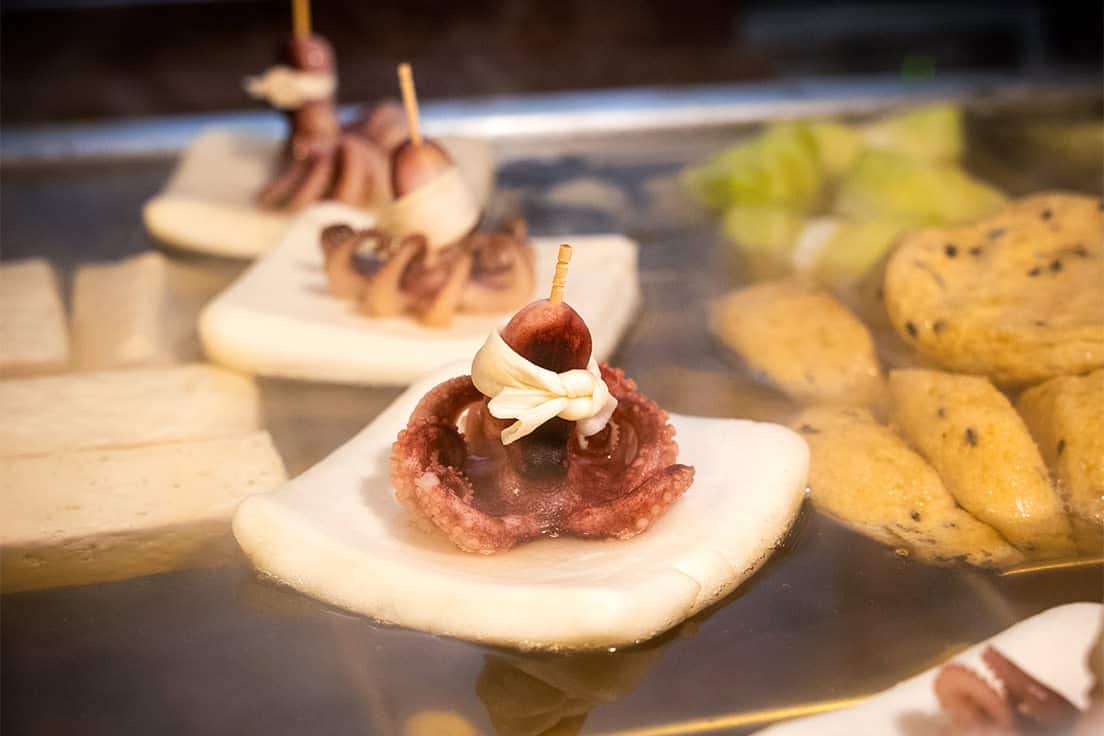 湯気が立つ鍋を覗くと、はんぺんに乗って浮かぶ鉢巻をした愛らしいイイダコに目が釘付けに。実はこれ「おでん三吉」の名物で、最近ではSNSでも話題になっている一品なのです。こちらのおでんは、青森県陸奥湾のイワシの焼き干しと昆布で出汁をとった、黄金色に透き通る濁りのないスープが自慢。さっぱりと薄味ですが豊かな風味を楽しめ、物足りなさは一切感じません。定番の大根や卵に混ざって自家製のおでんダネもあり、約25種から好みのものを選べます。