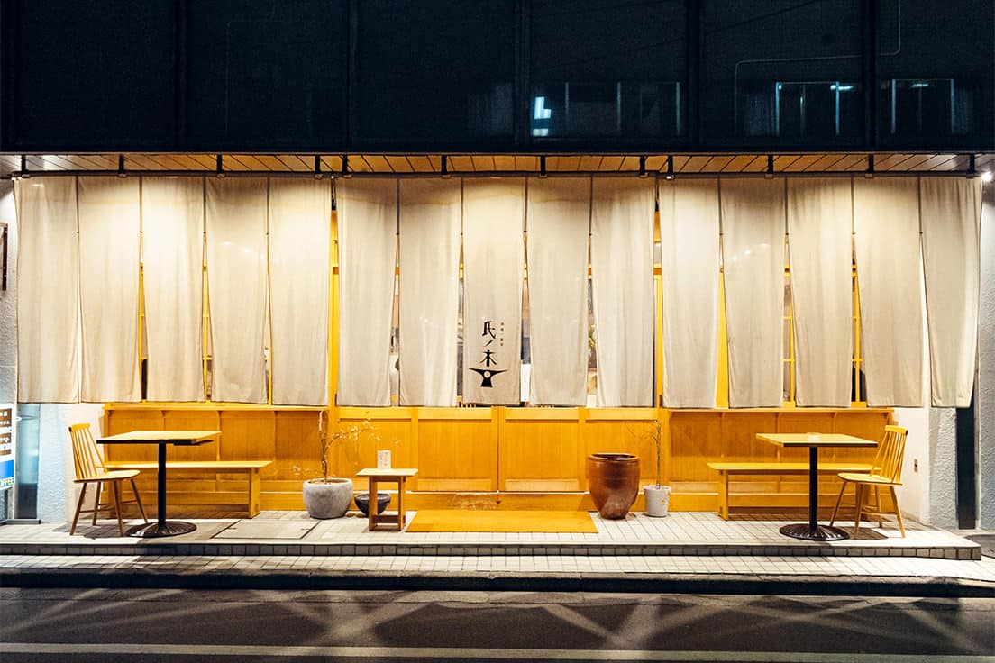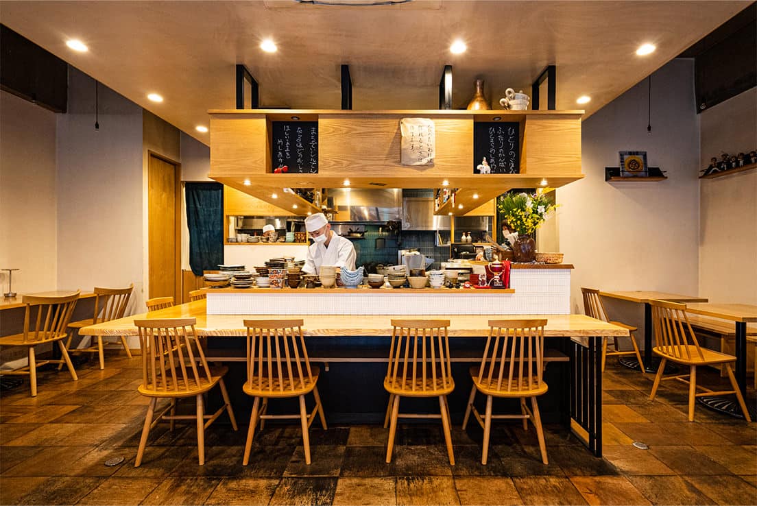 繁華街のはずれにある立地を物ともせず、夜な夜な客でにぎわう居酒屋「氏ノ木」。店内は中央のコの字カウンターと、テーブル席を用意。カウンターには趣の異なる風合いのよい器が並び、その向こうで料理を仕上げていく料理人たちの活気を感じながらお酒を楽しめます。