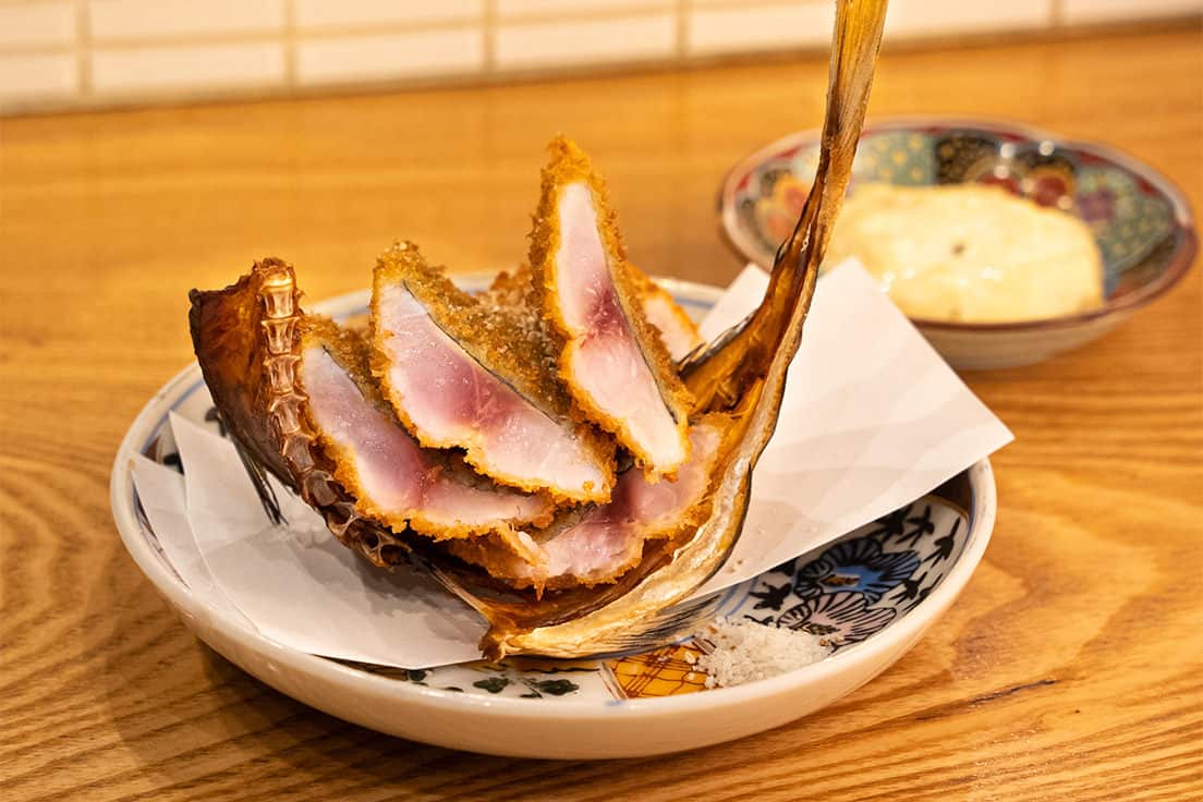 ここを訪れるほとんどの客のお目当てが、名物の「究極のアジフライ」です。さっそく注文すると、今まで食べていたそれとは一線を画すビジュアルにびっくり。刺身でもいただける鯵を高温でサッと揚げ、ほんのり赤みが残るくらいのレアに仕上げています。