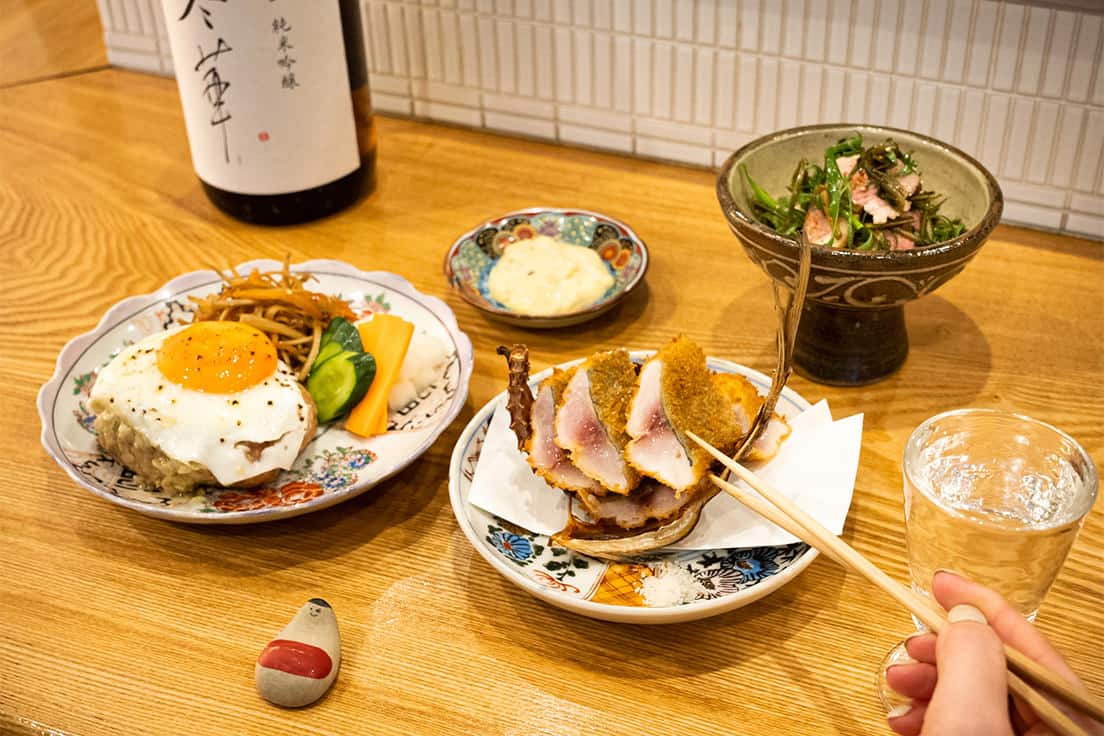 「氏ノ木」が人気の理由はアジフライだけにあらず、酒肴の充実と酒好きをそそる食材使いや味付けのセンスのよさにあり。例えばある日は、自家製の香味油で和えた「鴨とせり、九条ネギの和え物」や「金柑と生ハムとミントの白和え」など。和食主体でそこにひと捻りを加えた、食べ手をわくわくさせるようなメニューに胃袋を掴まれます。その一方で、ハンバーグステーキやカレーライスなど、“定食”を楽しめる自由さも備えています。