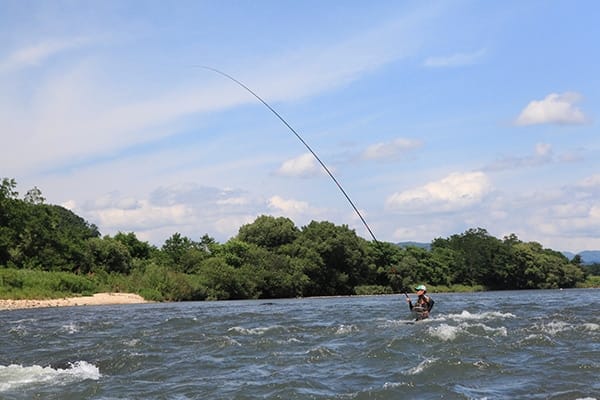 熊本県南部の人吉盆地を流れる球磨川は、全国屈指の大アユ河川として知られている。アユ釣りのシーズンは毎年6月から年内まで。なかでも彼岸花が咲くお盆明けからは、続々と尺上のアユが出る。釣り場は上流が球磨川と支流の川辺川の合流付近で、そこから下流の旧荒瀬ダム付近まで。広いエリアに熊太郎の瀬、修理の瀬、槍倒しの瀬など、良い瀬が点在する。