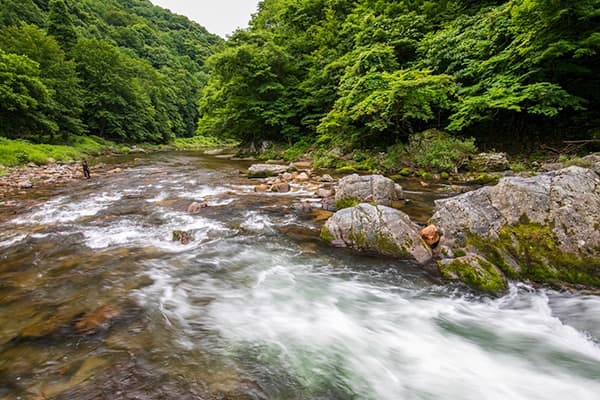 世界遺産の白神山地から流れ出る清流。全域が鰺ヶ沢町に属し、魚体が金色に染まるアユを地元では〝金アユ〟としてブランド化している。一番の魅力は何といっても豊富な天然ソ上。5月になると川を遡ってくるアユの匂いが分かるといわれるくらい、多数のソ上に恵まれる年もある。釣り場の核心部は中流域の種里地区、鬼袋地区で瀬とトロが連続する。